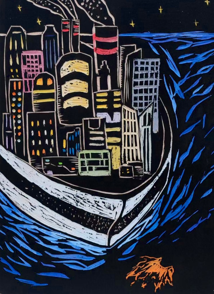 Our next trip was bound to the islands, and we had two days of rest before the new guests arrived. We were actually quite close to the city I was staying in before, so I decided to stop by my old block. The streets felt familiar, and I could easily trace the steps to my old apartment building. There was the same old chip in the sidewalk from when the drunk man living two floors below me crashed his car into the curb. The same advertisement was still there on the street corner, faded. A new superfood bistro had opened across the street, and their screen played the ad to the “Paradise Express” (Leaving in 2 days, LIMITED TICKETS STILL AVAILABLE). It had been long since I had gotten off the boat, and the soft hum buzzed in my ear, following me, even in the empty street. It was almost dark when I got back on the cruise, and I didn’t leave the cruise the next day, just played card games with other members of the crew.